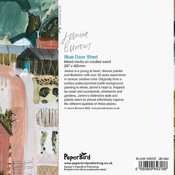 Blue Shed Door Greetings Card from Janine Burrows - a painter and illustrator with over 30 years of experience in various creative roles.