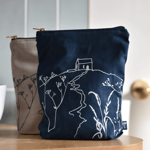 A beautiful collection of linen makeup bags with washable waterproof linings. Each makeup bag has been hand screen printed and made in our Cornish Studios. Perfect for travelling, long weekends and holidays or for organising your cosmetic and makeup essentials.