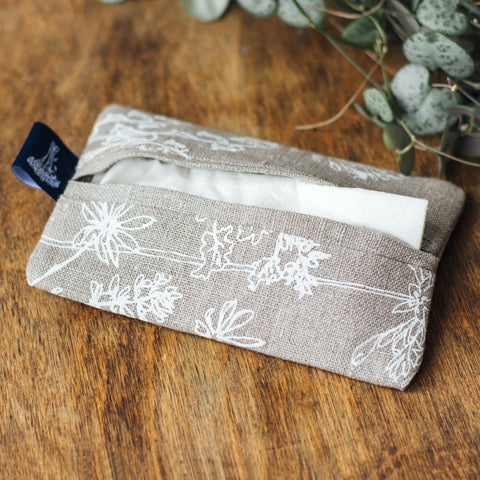 Great for storing tissues, this handy tissue pouch is made from pure linen, has a handprinted design and is made in our Cornish Studios. Perfect for popping in your handbag. Never be without a tissue!