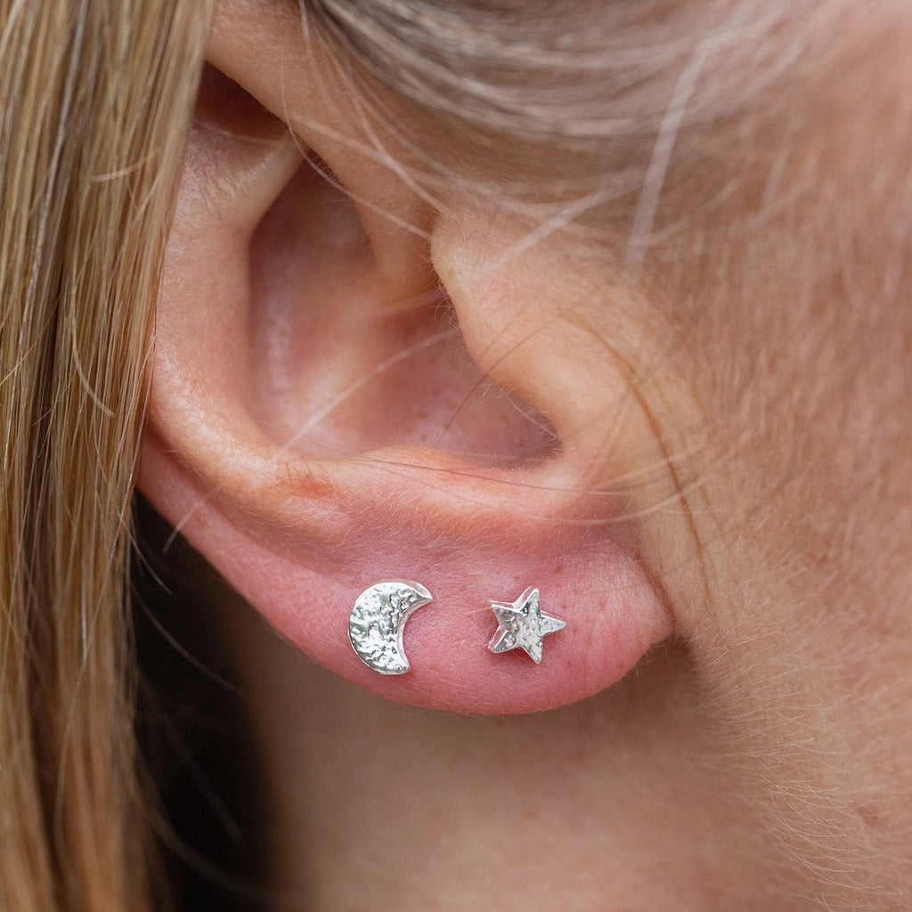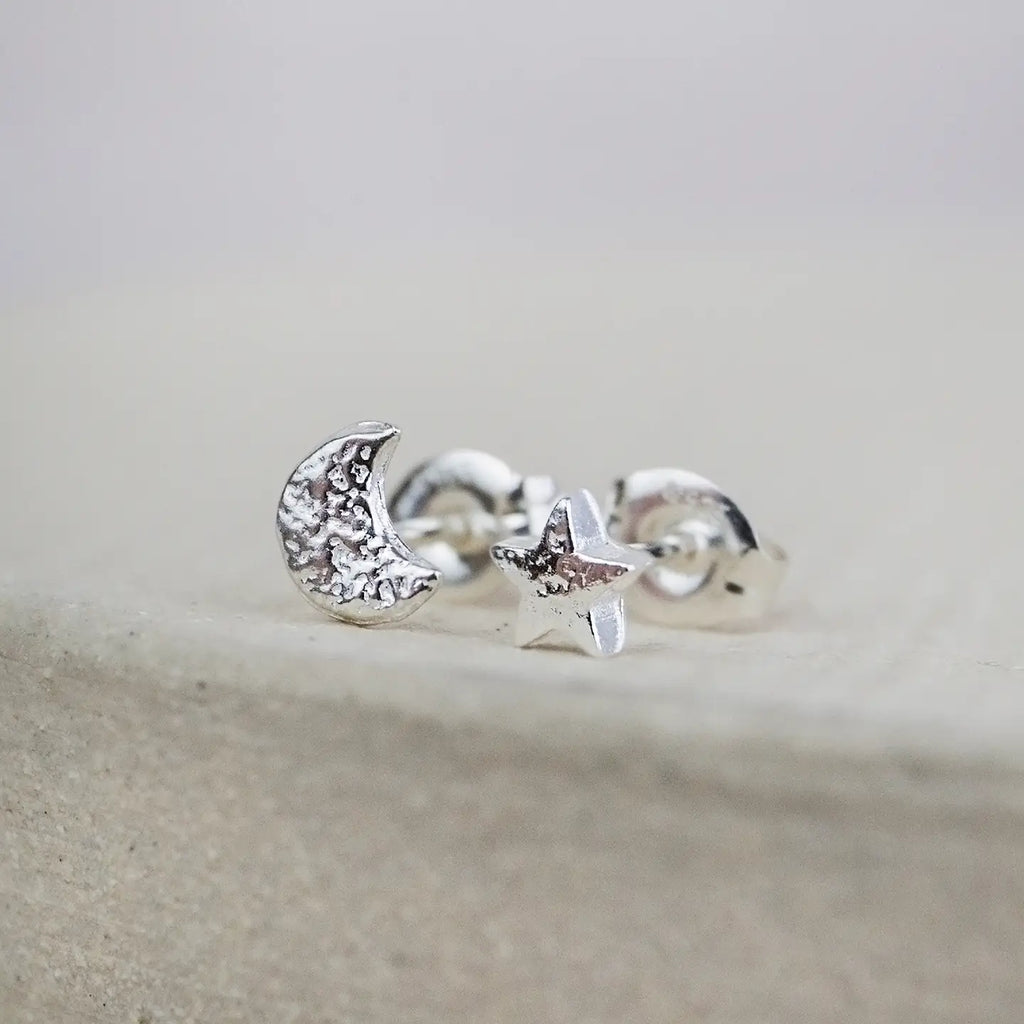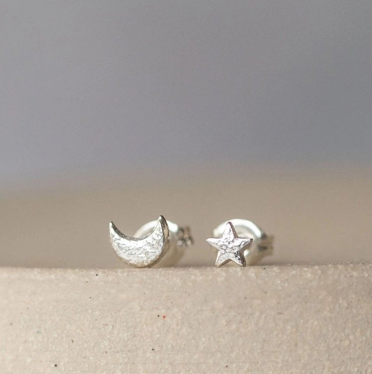 Handmade sterling silver mini moon and star studs are hand cut and delicately textured and are perfect for everyday wear.