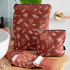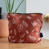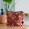 Crafted from high-quality linen fabric in a warm rust tone, this makeup bag is decorated with beautiful leaves, celebrating our natural environment and has a waterproof lining.