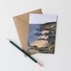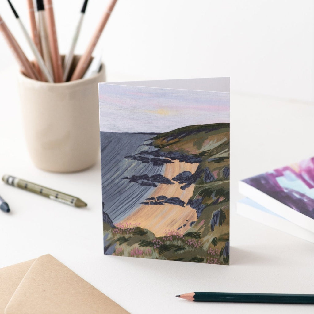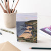 This luxury card features a mixed media landscape illustration of Whitsand Bay in Cornwall, on a beautiful summer evening.